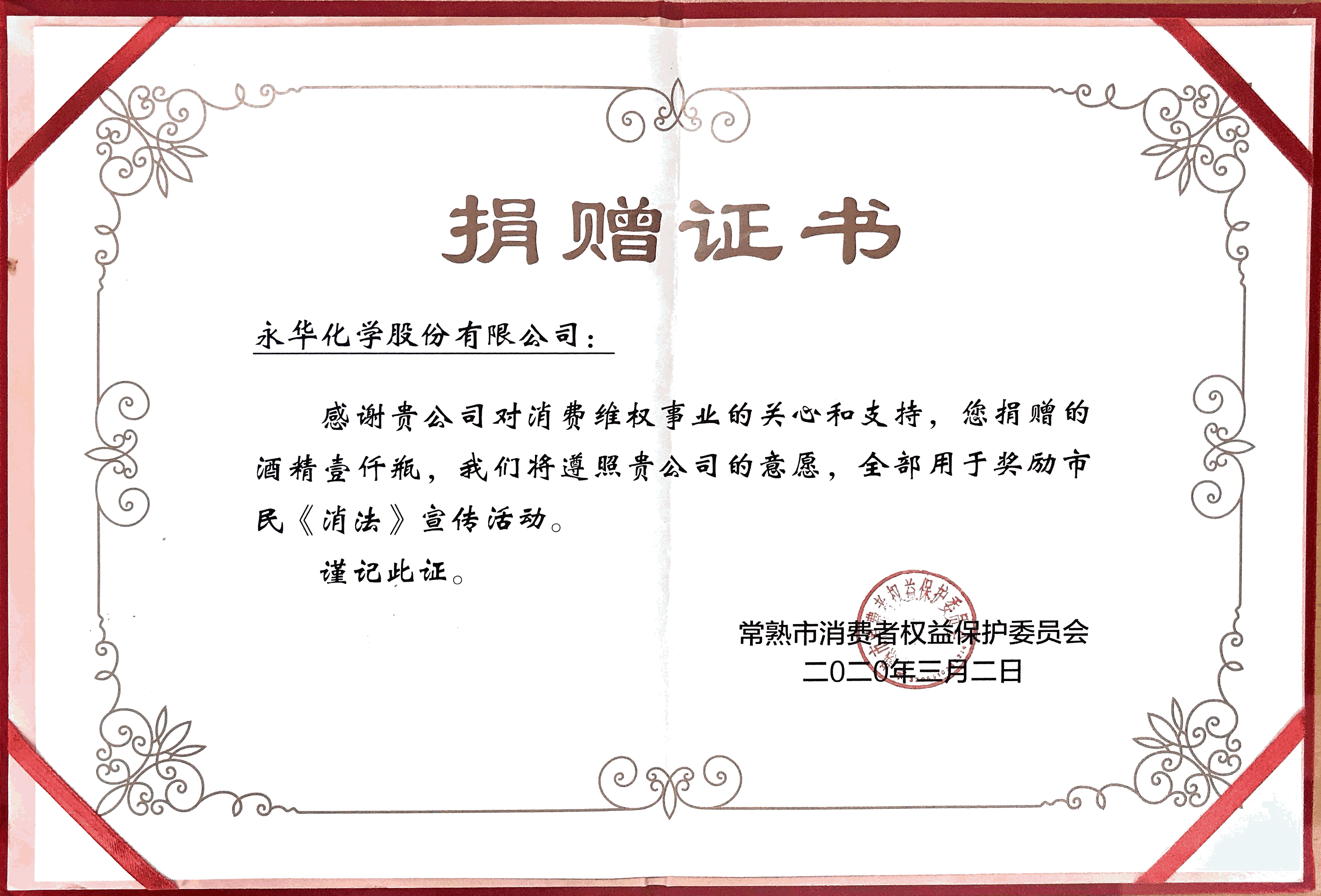 新冠肺炎疫情發(fā)生以來,疫情防控工作牽動(dòng)著每個(gè)人的心。永華一直高度關(guān)注疫情發(fā)展,在按照規(guī)定認(rèn)真做好公司疫情防控和生產(chǎn)經(jīng)營(yíng)部署的同時(shí),積極踐行社會(huì)責(zé)任。我公司向消費(fèi)者權(quán)益保護(hù)委員會(huì)捐贈(zèng)了一千瓶酒精,用于獎(jiǎng)勵(lì)市民《消法》宣傳活動(dòng)。